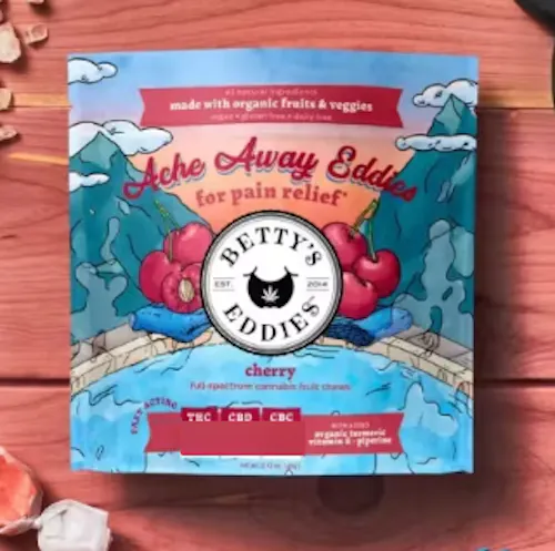 Betty's very cherry Ache Away Eddies are infused with a soothing blend of CBD, CBC & THC, plus a natural blend of turmeric, piperine, and vitamin E that may help ease inflammation and aid recovery.