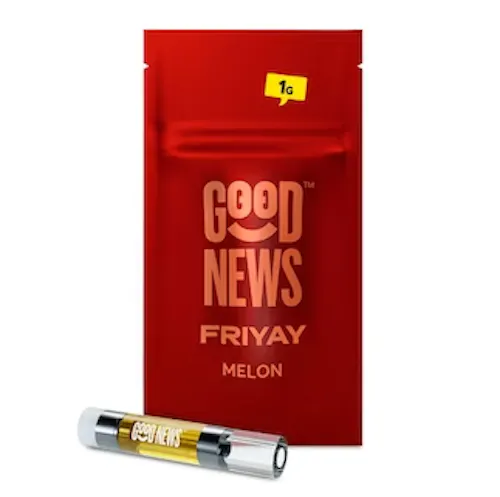 Cue the tunes, rally the crew and party like a rockstar! Its Friyay, this 1g cartridge is well equipped to help you take on the day! The Melon flavor pairs well with any Friyay adventure! Good News vapes are flavorful and ready to use right off the shelf. More discreet than a joint and faster-acting than edibles They're the perfect accessory for moments with friends. Easy to slip into a pocket purse or backpack. MELON Flavored Fri-Yay is a sativa leaning hybrid with a watermelon taste and scent.