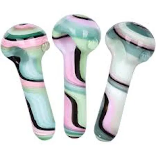 A Heady Ribbons Glass Spoon Pipe with a Marble is a handcrafted, artistic smoking pipe designed for both aesthetic appeal and functional, dry-herb use. Often measuring around 3 to 5.5 inches in length, these pipes are characterized by vibrant, swirled, or ribbon-like color designs that wrap around the borosilicate glass body.