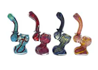 The Worked Fritted Bubbler Hand Pipe stands 4" tall and features hand-blown fritted boro glass with a recessed bowl. Color and size may vary.