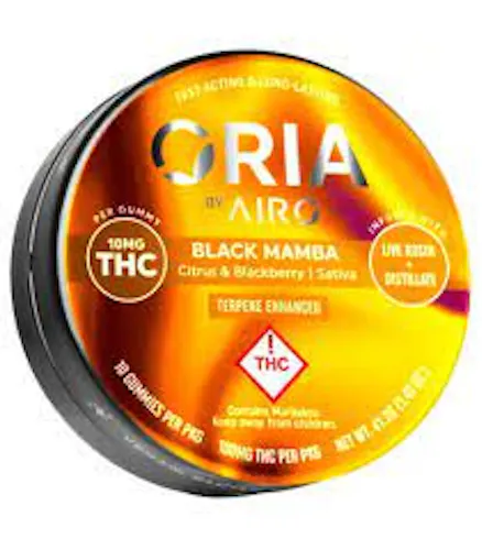 Oria Black Mamba gummies are Sativa-dominant edibles by Airo Brands featuring a blackberry and citrus flavor profile. They are made with live resin and full-spectrum distillate, are vegan and gluten-free, and contain 10mg of activated THC per gummy. The gummies are enhanced with terpenes like Myrcene and a-Pinene to provide uplifting and potentially focus-enhancing effects suitable for daytime use.