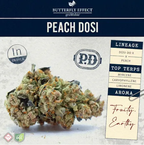 Butterfly Effect's Peach Dosi strain, an indica-dominant hybrid, is a cross between Do-Si-Dos and Peach Kush. It's known for its relaxing effects, calming tension while maintaining an uplifted mental state. The strain offers a sweet and fruity flavor profile with notes of peach and citrus balanced by earthy and herbal undertones.