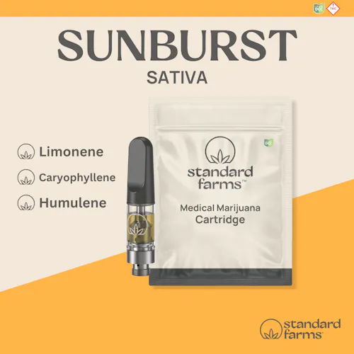 Standard Farms' Sunburst is a sativa-dominant hybrid (60/40) known for its uplifting, focused effects, tasting and smelling like skunky citrus (tangerine, lemon) with banana notes, often linked to Tangie Banana genetics, making it great for daytime focus or creative projects. It features fuel-like aromas and light green buds with orange pistils, offering a powerful, energetic high for creative or social activities.
