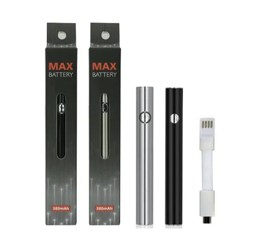 MAX Battery Vape Pen is a vaporizer pen battery featuring 380mAh, 510 thread, pre-heating, and adjustable voltage for thick or thin oil cartridges with magnetic micro USB charger in box.